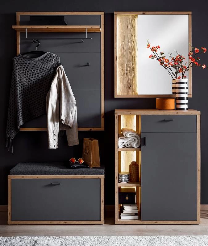 - Contenu de la livraison : Ensemble d’entrée comprenant 1 porte-manteau mural, 1 banc d’entrée, 1 miroir et 1 meuble d’entrée, sans éclairage ni accessoires